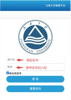 用户名为身份证号,初始密码为准考证上的考生编号后6位(请考生下载准考证查看,准考证打印系统网址:http://yzgmis.jiangnan.edu.cn/zsgl/bswb/login.aspx)。