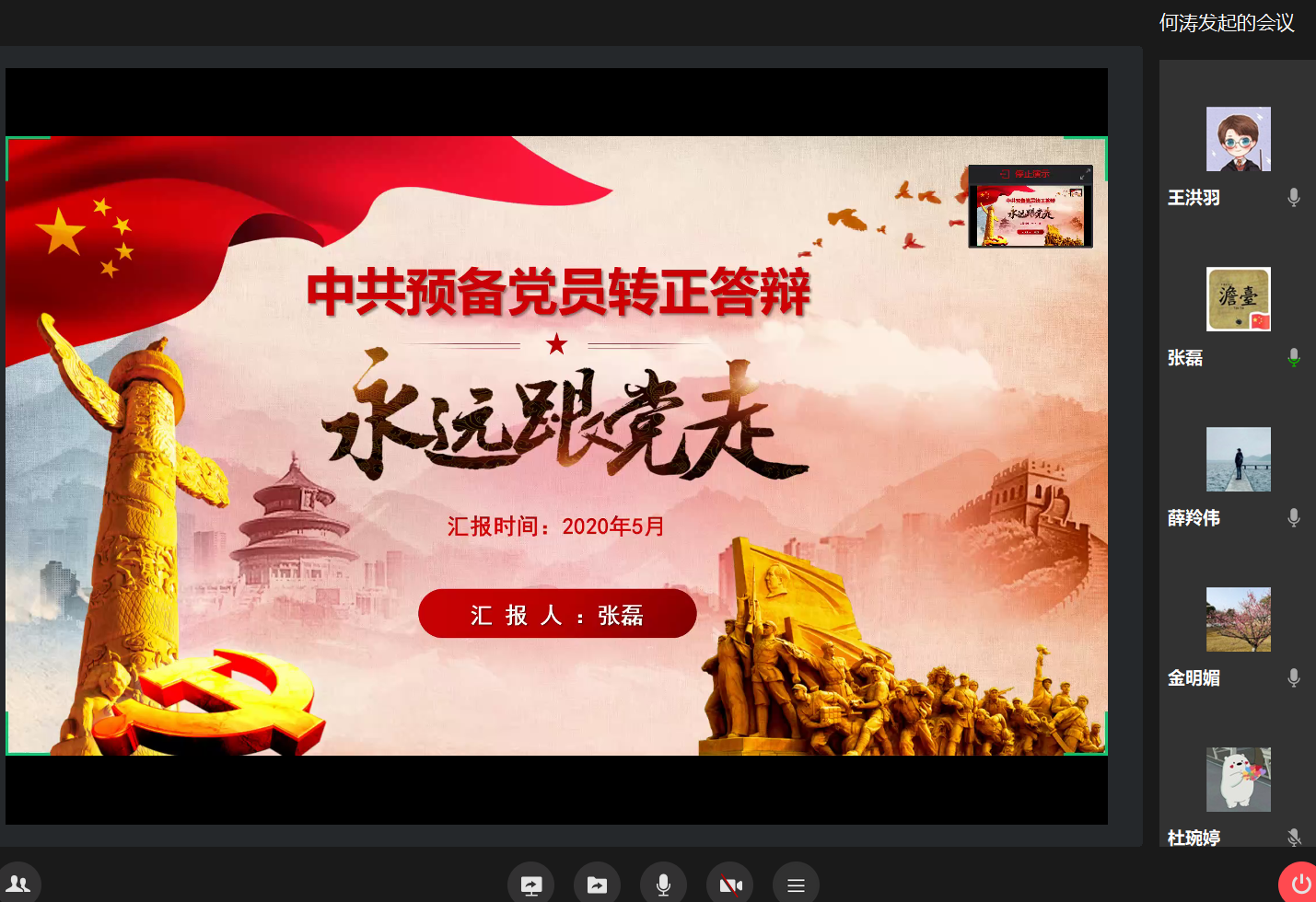 为进一步完善学生预备党员考察机制,促进学生党员学习两会精神,切实发挥学生党员先锋模范作用,环境与土木工程学院党委举行本学期预备党员转正答辩暨两会精神学习会。院党委副书记兼副院长金明媚,学工办主任蒋达锋,院党委秘书沈炎,辅导员周佳赟、薛羚伟担任答辩评委,本科生、研究生各支部党员参加会议。本次会议以线上形式开展,由辅导员何涛主持。