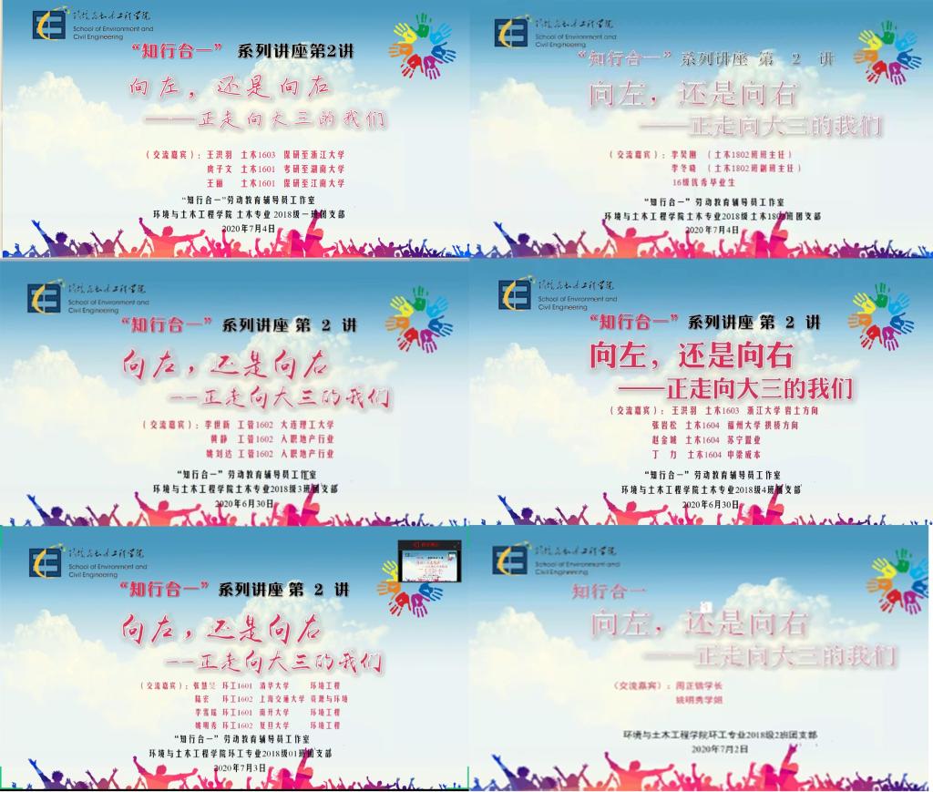 近日,环境与土木工程学院“知行合一”系列讲座第2讲以线上会议形式开展。土木工程专业与环境工程专业18级各班级陆续召开了“向左,还是向右--正走向大三的我们”主题班会。会议促进同学们对大二一学年的学习生活情况有所总结和反思,并对即将进入大三的自己做好详细的规划,成为更好的自己。