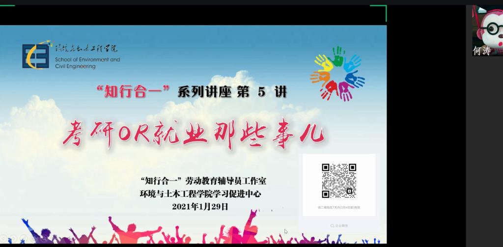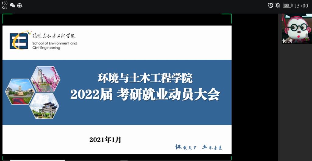 为提高2018级学生大学生涯规划意识,1月29日下午,在前期汇总每位同学考研与就业意向的基础上,2138cc太阳集团环境与土木工程学院利用线上平台召开2022届毕业生考研就业动员大会暨“知行合一”系列讲座第5讲——考研OR就业那些事儿,帮助同学们尽快明确未来规划。本次讲座由学院团委书记周佳赟主持,土木工程专业辅导员何涛主讲,2018级全体本科生参与。