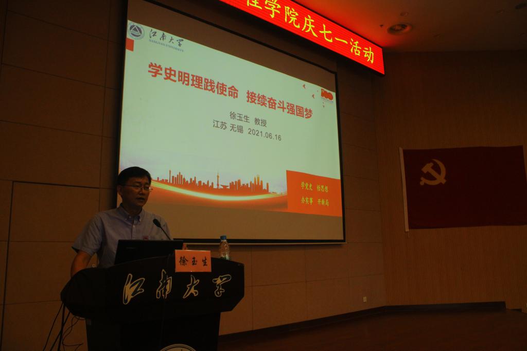 为进一步深化学习效果,将党史学习教育推深走实,院党委邀请校党史学习教育讲师团成员、马克思主义学院副院长徐玉生教授讲授专题党课。学院全体领导、院全体师生党员200余人聆听了党课。