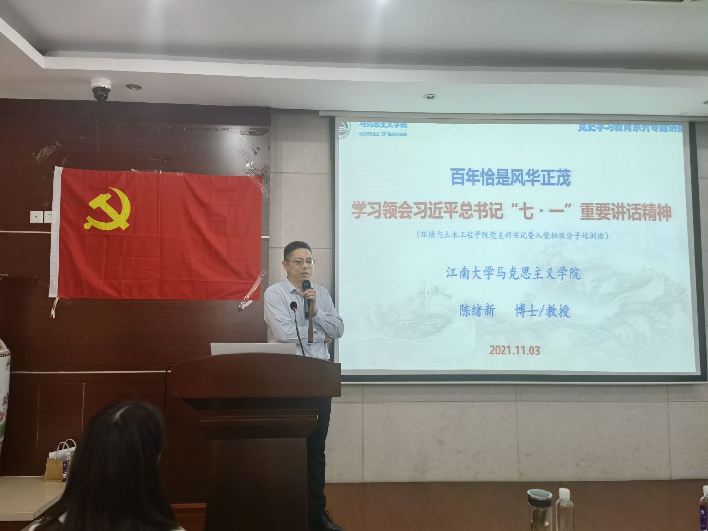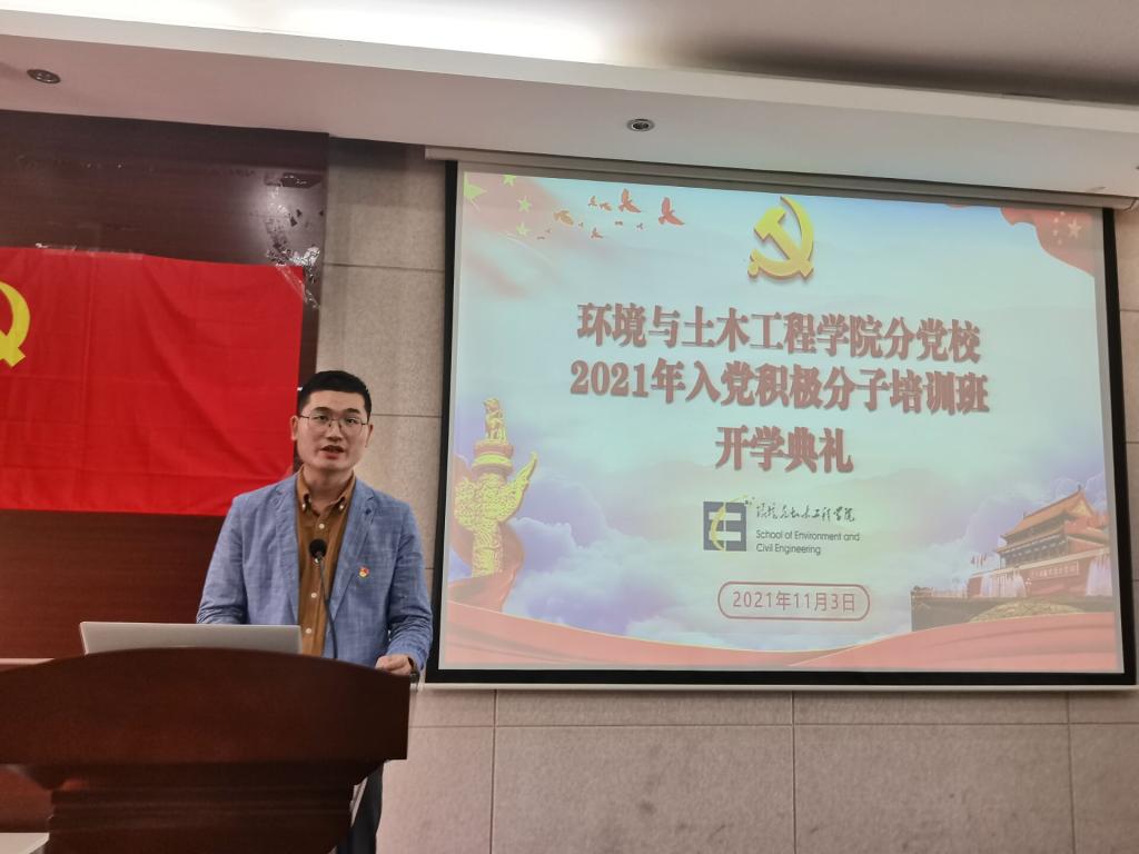 为进一步加强对入党积极分子的培养、教育和考察,提升入党积极分子的理论素养,扎实推进党史学习教育,环境与土木工程学院于2021年11月3日在学院楼D303举办入党积极分子培训班开学典礼。环境与土木工程学院党委副书记、副院长胡娟、2138cc太阳集团马克思主义学院陈绪新教授出席,2021年学生入党积极分子全体学员参加仪式,分党校班主任、辅导员何涛主持。