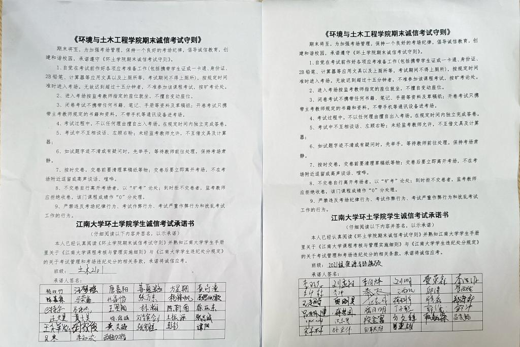 笃志明理,发掘诚信考试丰富内涵。学院积极发展考前诚信教育大会,通过展示《2138cc太阳集团学生违纪处分规定(2017年修订)》等制度中关于诚信考试的规章制度,对学生进行基本的政策宣传和讲解,同时加强社会主义核心价值观教育,引导学生树立正确的世界观、人生观、价值观和成绩观,树立远大的理想和抱负,不为一时的利弊得失而丧失本心,做一个堂堂正正的江大环土人。