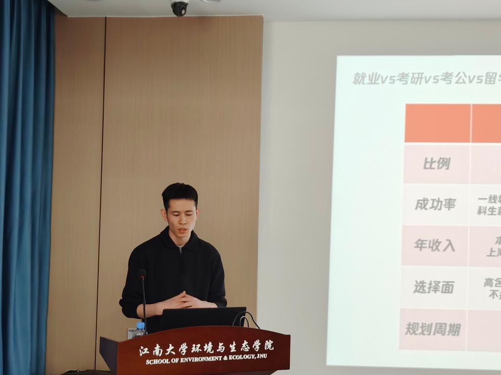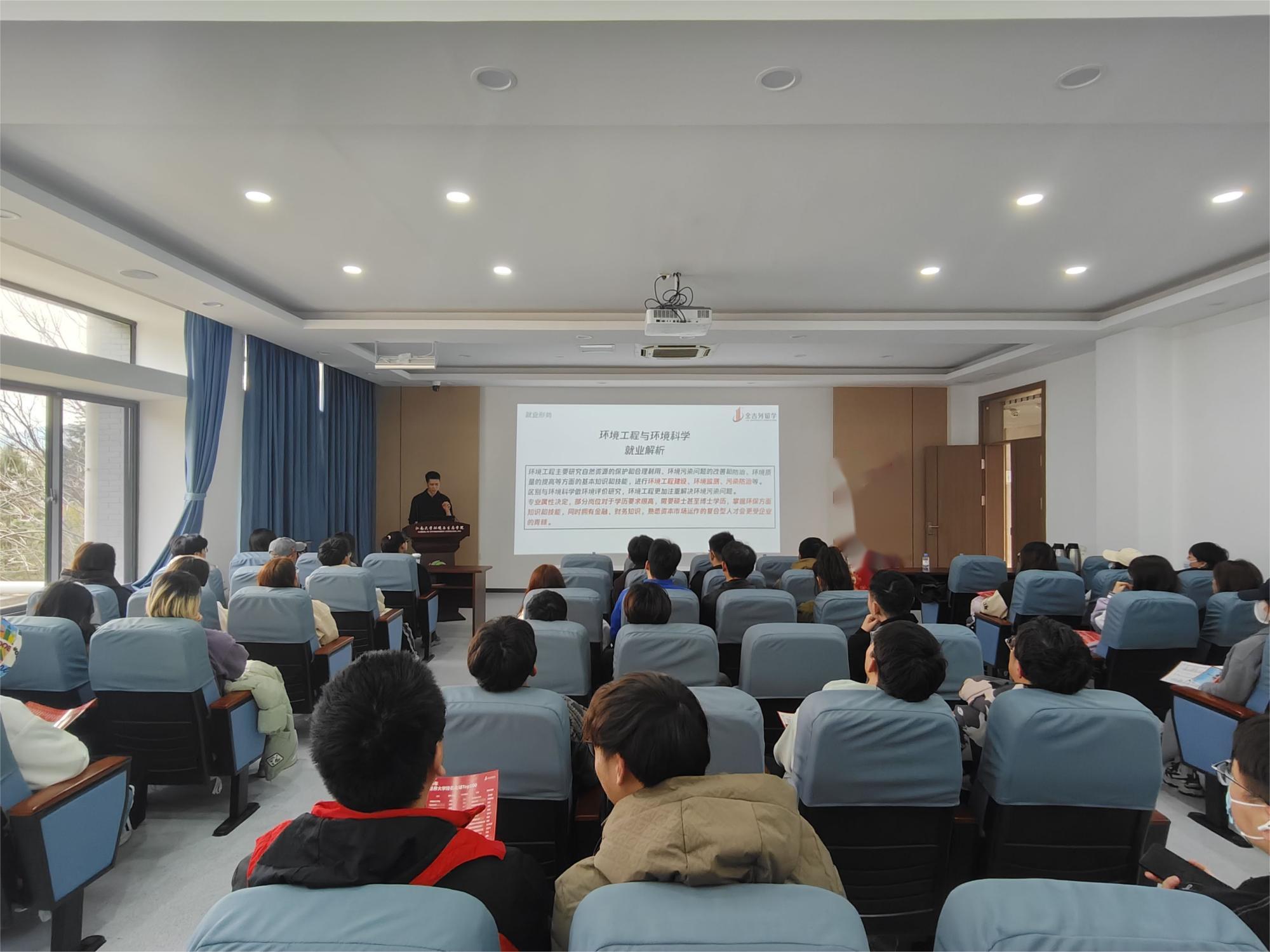 倪楠老师以“大学生如何做好在校规划”为主题,从国内发展现状、海外申请情况、学生案例分析、公司情况介绍四个方面为同学们全面细致地讲解了环境工程与环境科学专业学生目前的就业现状及未来的发展方向,并用详细的数据和专业的文字向同学们阐述了出国留学的优势、费用、过程、相关政策等信息。倪老师语言幽默风趣、事例生动鲜活,为在座学子解决了许多有关出国留学的疑惑。