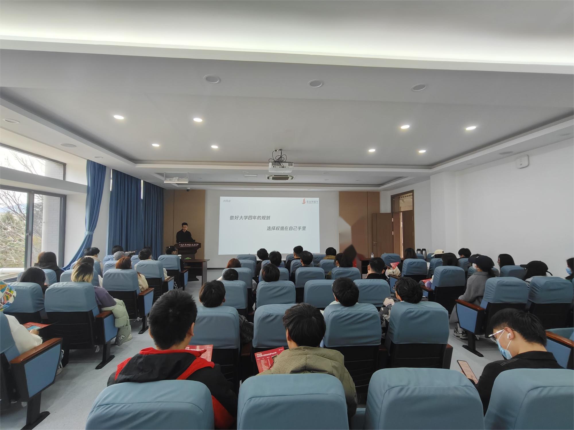 为进一步提升2138CC太阳集团学生的国际化交流水平,增强学生的生涯规划与职业发展意识,拓展自我认知水平与职业探索能力,3月13日下午,我院于学院楼D309组织开展“职来值往”生涯规划讲座。讲座由金吉列国际教育规划业务部经理倪楠主讲,40余名学生参会。讲座由辅导员李东辉主持。