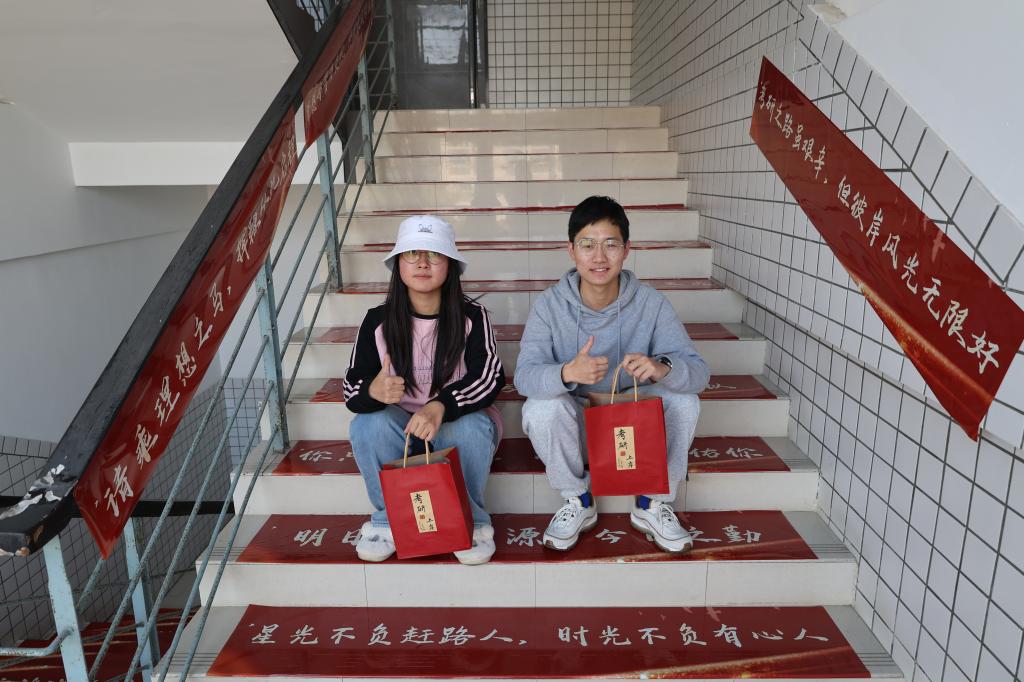 随后,学院为同学们准备了“上岸红毯”,在楼梯台阶上贴满了密密麻麻的考研祝福语,每一条都饱含学院师生的殷殷祝福;学院还为考研学生准备了精美的考研大礼包,礼包中准备了同学们所需的文具用品,以及一份“准录取通知书”,为同学们加油打气,还有一些寓意深刻的慰问品,如橙子寓意胸有“橙”竹、心想事“橙”,状元糖寓意金榜题名、状元及第等。这些礼物不仅体现了学院对考研学生的深情厚谊,更传递了学院对他们的殷切期望和美好祝福。