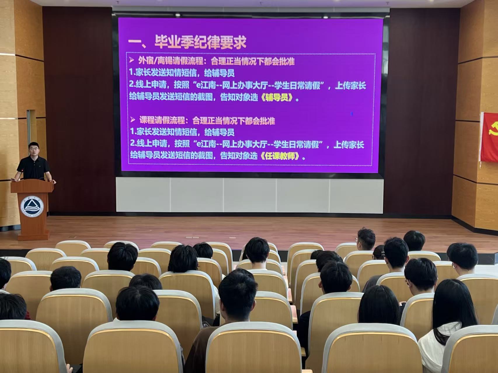 会上,李东辉详细解读了毕业季纪律要求,重点强调了考勤纪律与考试管理规定,明确违反考勤纪律和考试管理规定的处分细则,要求同学们严守校纪校规,以严谨的态度和良好的风貌完成学业。随后,李东辉从谨防诈骗、网络和信息安全、心理健康与安全等维度开展安全主题教育,列举了仿冒身份类、利益诱惑类等多种诈骗类型,普及网络发言规范,同时针对毕业季常见的心理压力问题,为毕业生提供学校及无锡市、江苏省多级心理援助渠道,筑牢学生安全防线。