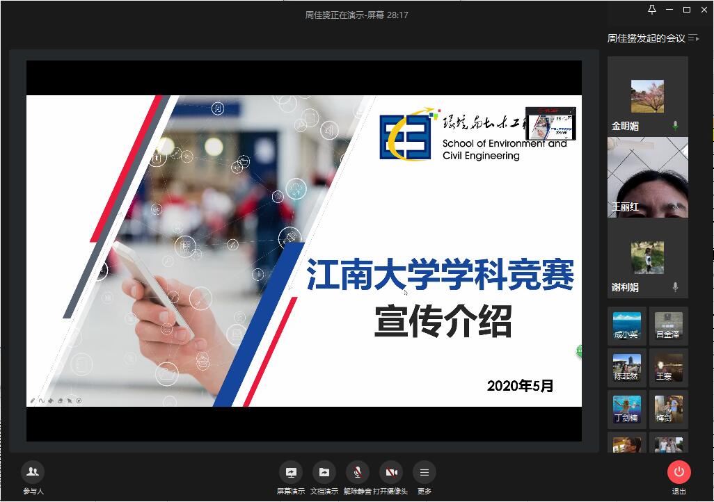 为进一步推进我院学科竞赛工作,激发教师参与大学生学科竞赛指导工作的积极性,2020年5月13日下午,环土学院利用企业微信平台召开2020年学科竞赛推进会。院党委副书记兼副院长金明媚、学院学工办主任蒋达锋、学院各科研团队教师代表参加会议。辅导员周佳赟主持会议。