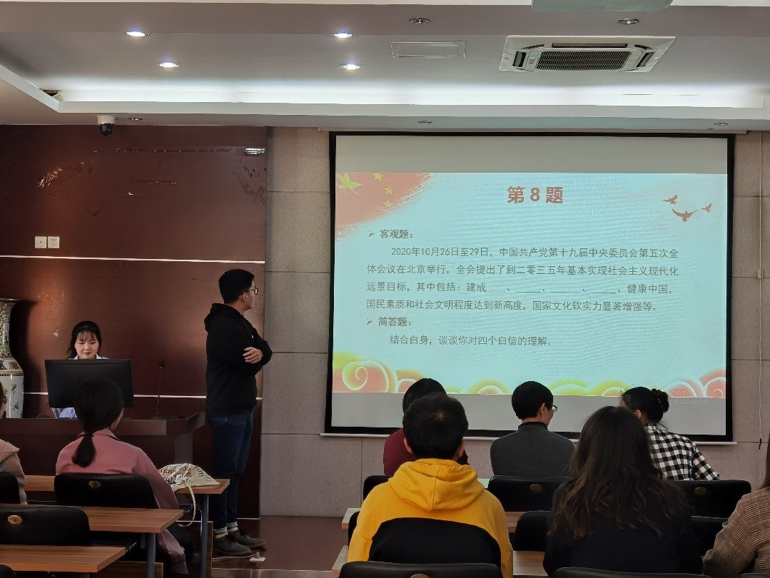 沈炎在答辩过程中细心引导学生党员,合理分析主观论述题,深化学习党的十九届五中全会精神。周佳赟在总结交流中寄语学生党员,要主动加强理论学习,关注时政热点,增强理论素养;要以答辩会为契机,检视自身不足,不断完善自我;要积极履行党员义务,做到“从群众中来,到群众中去”;在学习生活工作中,要发挥党员先锋模范作用,牢记入党的初心和使命,为2035年的远景目标不断追求与奋斗。