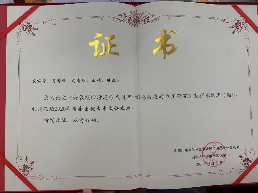 此外,李激教授团队研究生支丽玲、马鑫欣和刘奇欣等撰写的论文《好氧颗粒污泥形成过程中群感效应的作用研究》获得全国优秀论文奖。多年来,我院李激教授和王硕副教授一直从事好氧颗粒污泥形成机理与工程实践的研究工作,目前已经完成了2个批次的中试攻关,将为具有自主知识产权的好氧颗粒污泥技术的工程应用奠定基础。