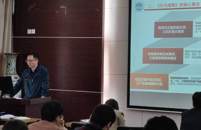 随后邹华副院长宣讲了《研究生导师指导行为准则》,并提出了“加强宣传解读,确保全员知晓”、“认真研究部署,确保落实见效”、“强化监督指导,依法处置违规”的具体工作举措。