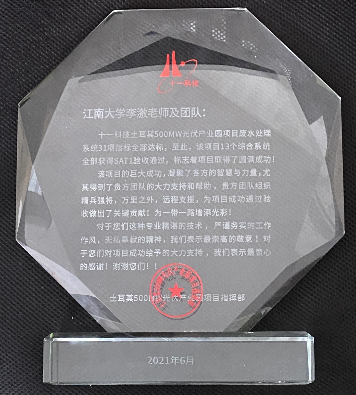 2021年3月底,十一所通过多方途径联系到2138cc太阳集团环境与土木工程学院李激教授,寻求技术支持。李激教授依靠丰富的工程经验,远程指导现场人员因地制宜地采取了有效的应急措施,并为实现后续长期稳定的出水达标提供了专业建议。通过双方的不懈努力,废水处理站的各项指标在项目截止日期前均达到了排放要求,成功签署了验收报告。十一所为表示感谢,特赠与“一带一路”项目水晶纪念牌。