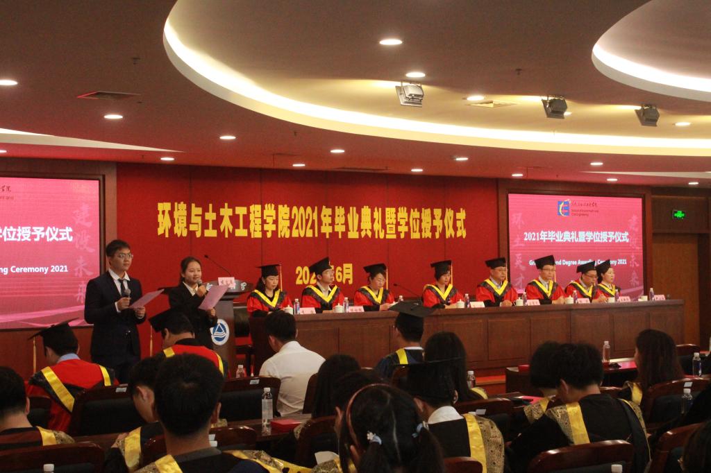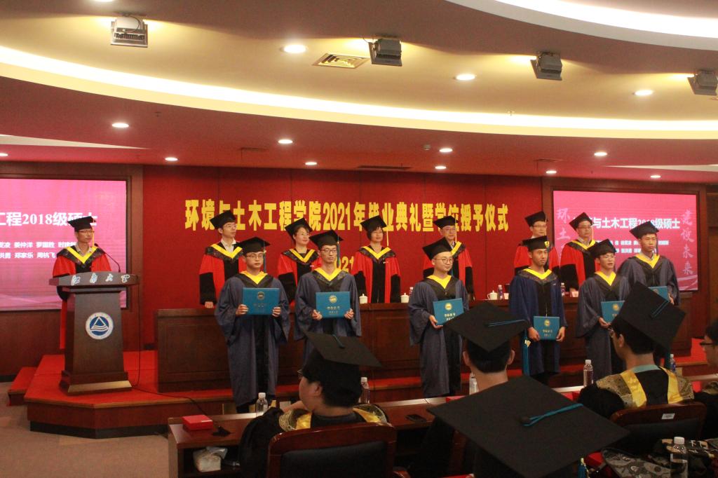 典礼结束后,环境与土木工程学院2021年学位授予仪式隆重举行。系主任宣读名单,辅导员、班主任为毕业生拨穗,院领导为毕业生颁发学位证书并合影留念,为同学们在2138cc太阳集团的学习生涯画上完满的句号。