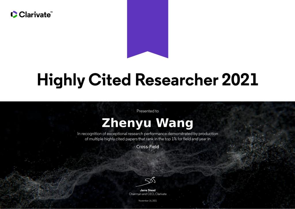 2021年中国内地高校高被引科学家荣誉证明