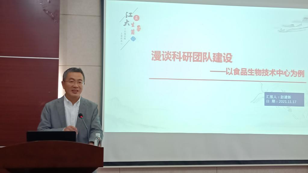 报告会上,赵建新教授从自己的科研经历出发,阐释了团队的重要性,他认为团队建设是学科特色、学校发展、产业发展和教师成长的需要,团队可以合理利用和发挥每个成员的知识技能、优点长处,以期实现共同的目标。在团队建设方面,赵建新教授认为发展才是硬道理,团队必须有明确的目标和规划,有所为有所不为。而且,团队的发展必须有计划,完善的计划是目标落实的具体方案,核心人员要制定年度计划考核基准,团队成员要制定个人年度计划,对标完成。当然,落实是最关键的,负责人和骨干教师要加强督促和帮助,团队成员间分工协作、取长补短,以期达成共同目标。