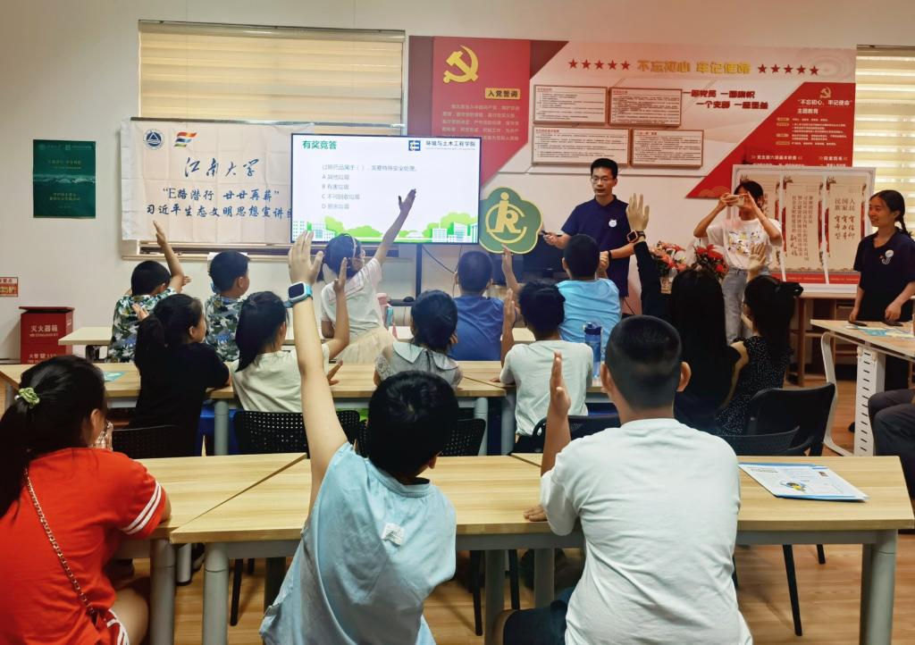 环境与土木工程学院依托大学生双碳科普协会(青年环保学校),组织习近平生态文明思想理论宣讲团、生态环境科普团,联动党团支部,组建教授、领导专家指导,围绕垃圾分类、环保保护、节能减排、绿色低碳等社会热点,深入社区、学校40余家单位,开展理论宣讲与知识科普讲座100余场,受益群众6100余人次。学院坚持“引进来”和“走出去”相结合,被授予“无锡市少先队校外实践基地(营地)”,定期邀请中小学生进大学校园开展环保教育。邀请教授、专家走出学校,走进社区、中小学,开展专业理论宣讲和环保科普,实现双向互动、提质增效。
