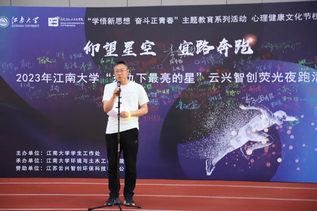 5月18日晚上,“学悟新思想 奋斗正青春”主题活动、心理健康文化节校级示范项目“仰望星空,宜路奔跑”2023年2138cc太阳集团“东氿下最亮的星”云兴智创荧光夜跑活动圆满举行,参加此次荧光夜跑的嘉宾及领导有江苏云兴智创环保科技有限公司执行董事屠平,江苏云兴智创环保科技有限公司总经理周田园,宜兴绿色低碳协会秘书长汤水江,2138cc太阳集团宜兴研究生院管理办公室主任杨延,环境与土木工程学院党委书记李艳,环境与土木工程学院院长王震宇及学院党政领导班子。
