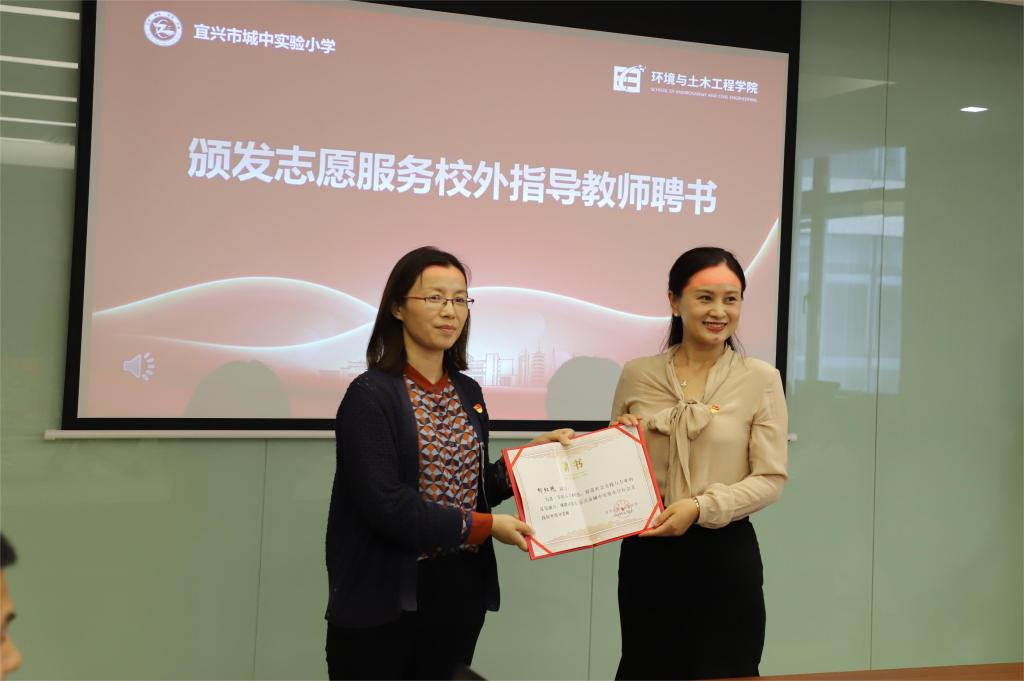 宜兴城中实验小学党支部书记马进、环境与土木工程学院教工环境二支部书记郁红艳、东氿校区研究生第一、第二党支部书记万骋宇、毛雪莲共同签署了党支部共建合作协议,希望通过整合资源,充分发挥各自优势,资源共享,以优质党建推进2138cc太阳集团环境与土木工程学院和宜兴市城中实验小学的高质量协同发展,共同推进基层党建工作。党建联盟授牌仪式上,马进向学院赠送“有光红盟”牌子,并为郁红艳颁发宜兴市城中实验小学志愿服务校外指导教师聘书。