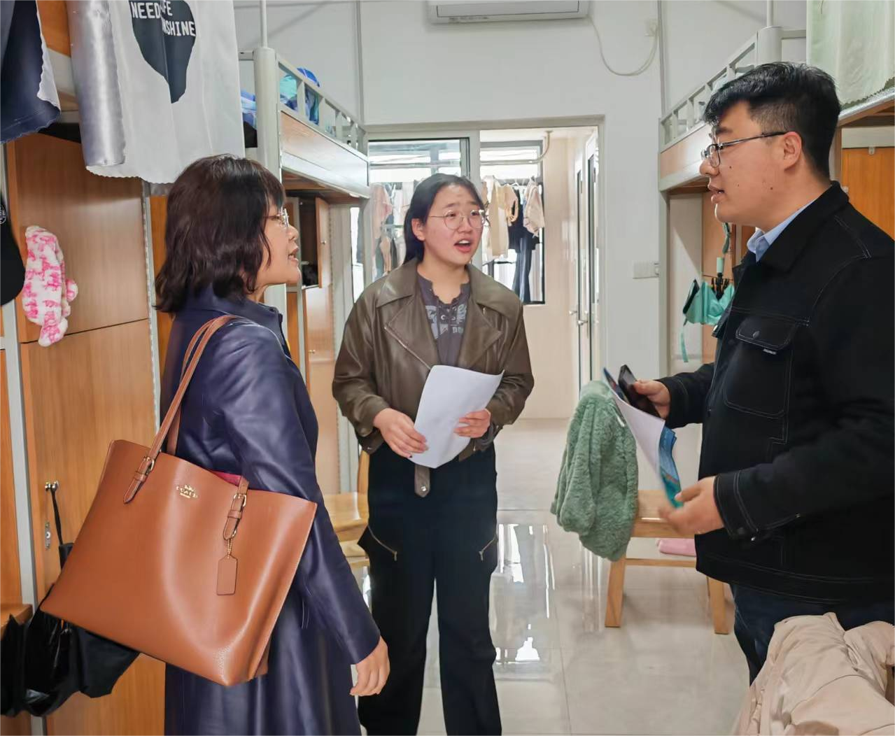在实验室走访中,学院领导详细了解了各实验室的科研项目、设备设施情况以及实验室管理情况,强调实验室安全建设对于学院的重要性,要求师生要强化实验室安全红线意识,牢固树立实验室安全发展理念,从源头上消除实验室安全隐患,学院将不断推动师生合力筑牢实验室安全防线,创造和谐、安全、稳定的科研和学习环境。在走访学生宿舍的过程中,重点关心因毕业设计临时搬迁东氿的14位本科生。学院领导和学生进行了面对面亲切交流,提醒学生遵守各项管理规定,高度重视宿舍防火用电安全,提高反诈意识,通过保持宿舍整洁有序,养成健康的生活习惯。