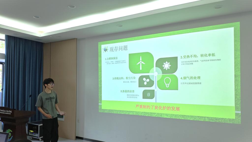 各组参赛选手依次向评委展示作品,重点从创新性和科学性等维度详细说明其在节能减排方面的技术突破和实际应用效果,突出作品的环保价值和实用意义。