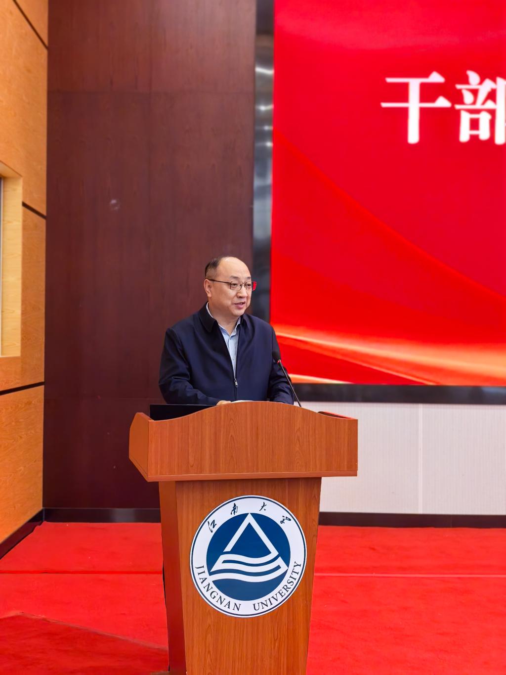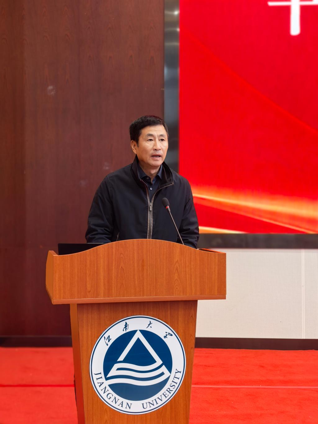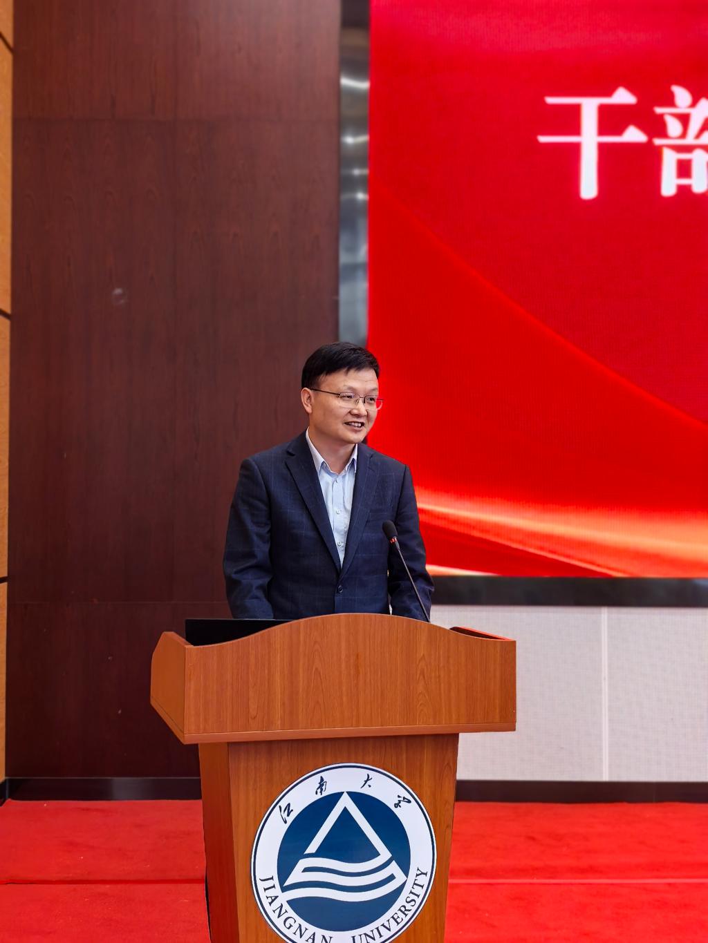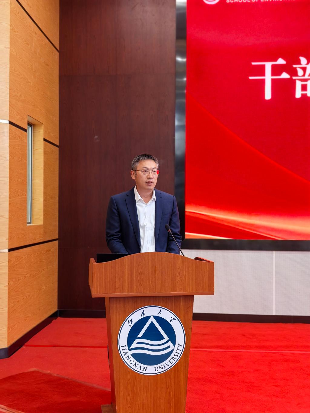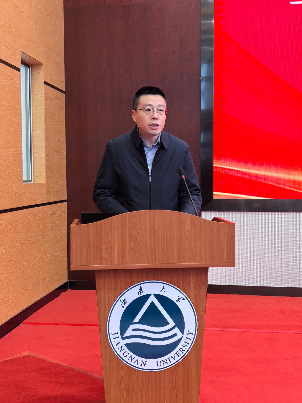 戴月波发表讲话。在讲话中对环境学院近年来的发展成就给予充分肯定。他指出,在原领导班子的带领下,环境学院在学科建设、人才培养、科学研究、社会服务等方面取得了显著成效,学科影响力持续提升,培养了一大批高素质环境领域专业人才,为国家生态文明建设和区域环境治理作出了积极贡献。针对学院未来发展,戴月波副校长提出三点要求:一是要志存高远,锚定发展坐标。立足生态文明建设全局,融入学校“一体两翼”发展战略,不断提升班子凝聚力和战斗力;二是要抓住机遇,激活发展动能。深化与宜兴环保企业、科研院所的产学研合作,推动科研成果就地转化,将学科特色转化为服务地方发展的核心竞争力,同时以社会服务需求反哺学科建设,实现学科发展与地方经济的同频共振。三是要真抓实干,夯实发展根基。聚焦学院发展中的重点难点问题,加强学科交叉融合,凝练研究方向,打造特色优势学科集群。