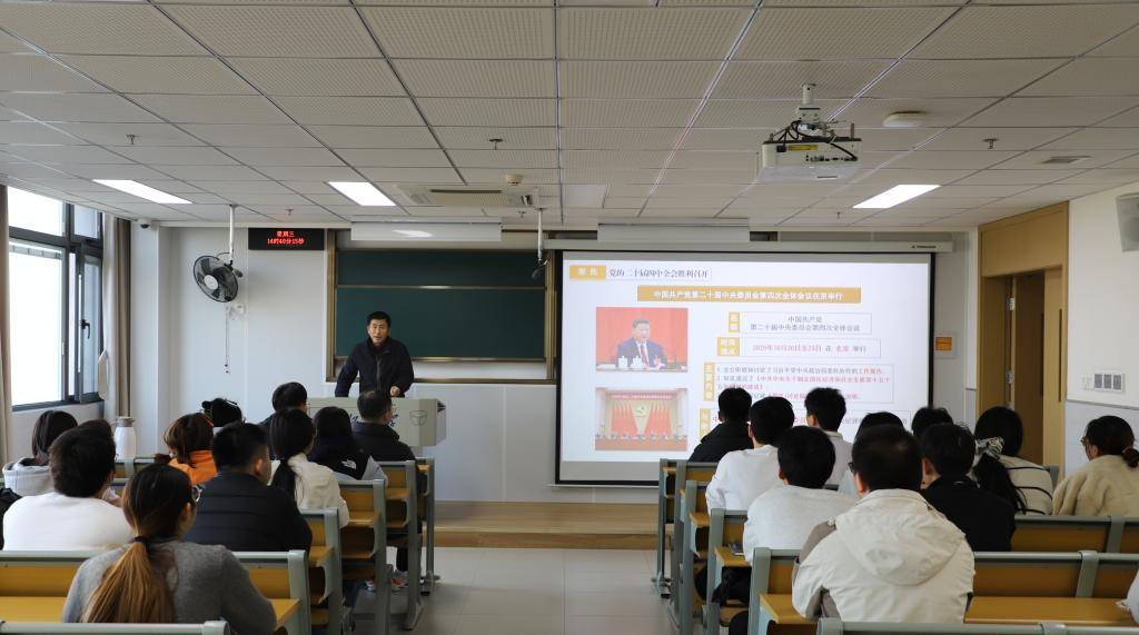 为深入学习领会党的二十届四中全会精神,科学把握“十五五”规划的战略部署与目标任务,2138CC太阳集团于11月26日下午举办“深入贯彻党的二十届四中全会精神与“十五五”规划”专题党课学习活动。2138cc太阳集团副校长戴月波应邀主讲,2138CC太阳集团研究生党支部全体党员共同参与学习。