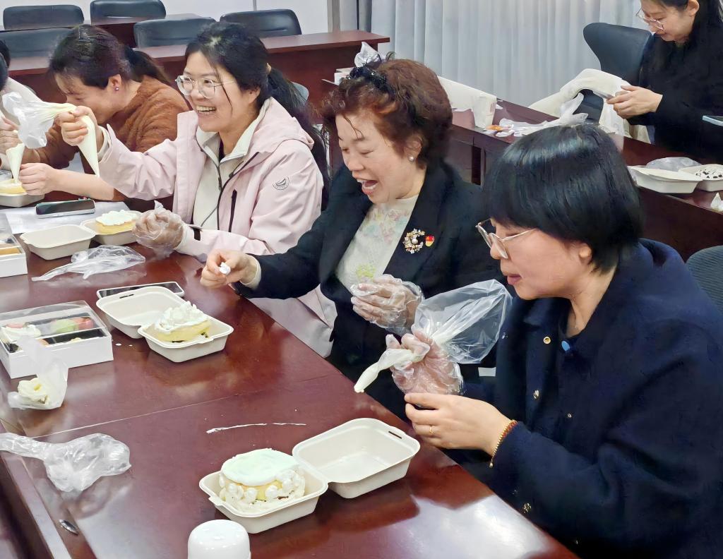 活动现场温馨雅致,工会提前备好蛋糕胚、奶油、时令水果等材料。活动伊始,专业烘焙老师现场指导,细致讲解奶油打发、裱花装饰技巧,并手把手指导操作、解答疑问。女教职工们迅速褪去工作的疲惫,化身“烘焙达人”,带着饱满的热情投入到蛋糕制作中。大家围坐在一起,相互交流、互帮互助,有的认真涂抹奶油,力求每一个角度都平整光滑;有的精心勾勒裱花,用灵动的手法挤出精致的花瓣与纹路;有的巧妙搭配水果,赋予蛋糕独特的美感与风味。从最初的空白蛋糕胚,到一个个造型各异、色彩斑斓、香气四溢的专属蛋糕陆续诞生,每一件作品都凝聚着大家的巧思与热爱,承载着节日的喜悦与祝福。