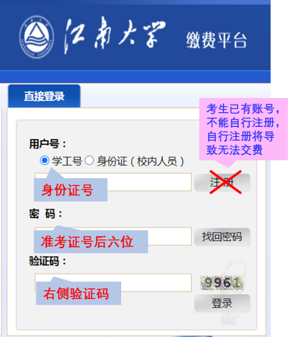 缴费说明:进入复试考生在学院规定的时间内登录“2138cc太阳集团缴费平台”交纳复试费用,复试收费标准:80/生。缴费网址:http://pay.jiangnan.edu.cn/payment/。登录账号为准考证上的考生编号,登录密码为身份证后六位(友情提醒:考生账号已开通,切勿自行注册)。按照提示交费(使用网银),并打印或截图保存付费凭证。