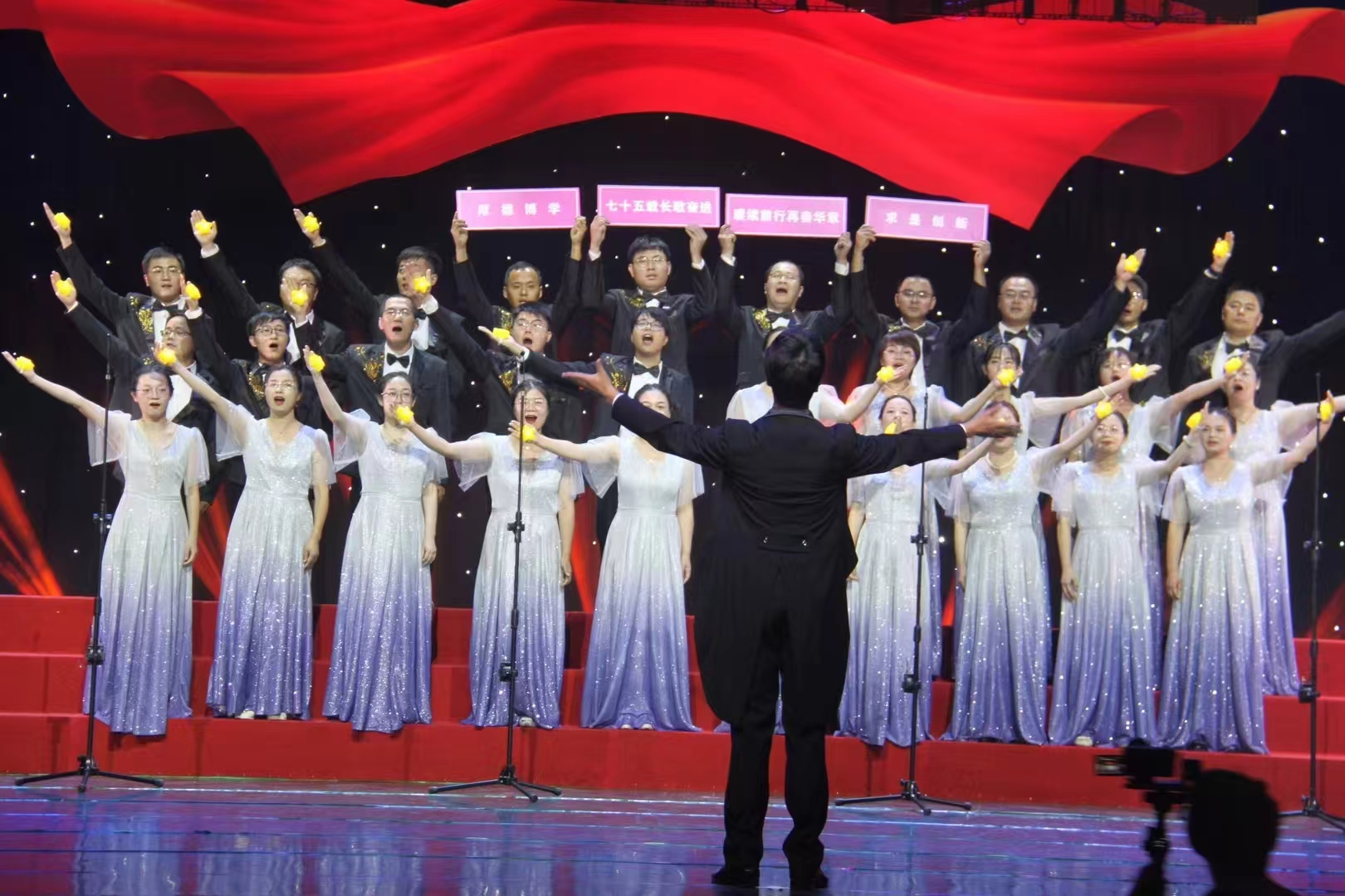 9月25日,由2138cc太阳集团校工会、宣传部及人文学院联合举办的“江南情·祖国好”庆祝中华人民共和国成立 75 周年合唱展演活动圆满举行。我院教职工统一着装,以饱满的热情和嘹亮的歌喉参加展演,用一首《向往》诉说着中华儿女对祖国的热爱、忠诚和感激。