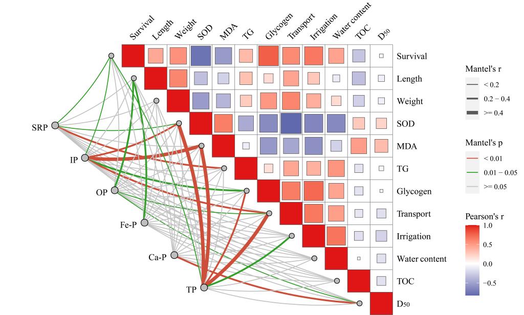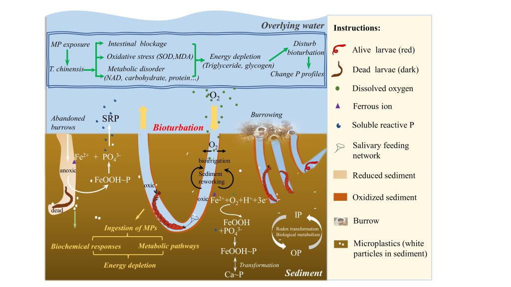 微塑料被摇蚊幼虫摄入后,会阻塞其消化道,造成假饱腹感,使得摇蚊幼虫进食能力受损,产生氧化应激,碳水化合物、脂质、核酸等合成及代谢功能异常,进而导致机体能量储备降低。糖原等能量耗竭削弱了摇蚊幼虫的生物灌溉能力,损害其对底栖微生境的改造强度,最终导致沉积物—水界面的磷酸盐再分配,影响了磷素的生物地球化学循环过程。