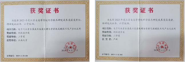 根据《省教育厅关于公布2023年度江苏省高等学校科学技术研究成果奖获奖成果名单的通知》,我院严群教授团队联合江苏中电创新环境科技有限公司、靖江华晟重金属防控有限公司共同申报的《电子行业重金属废水深度处理与资源化关键技术及产业化应用》获得2023年度江苏省高等学校科技进步奖二等奖。