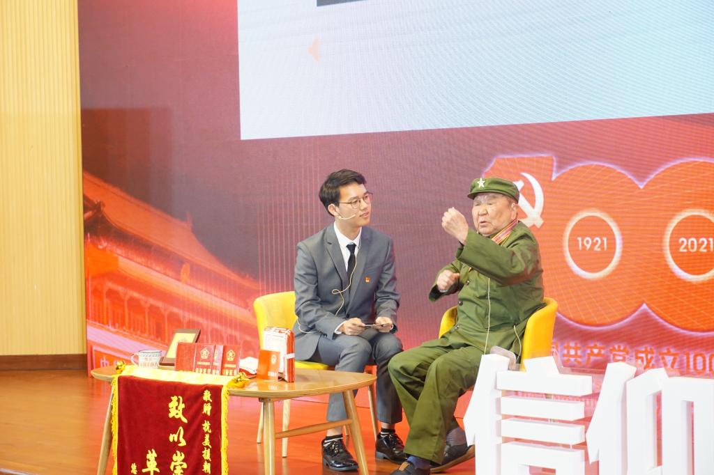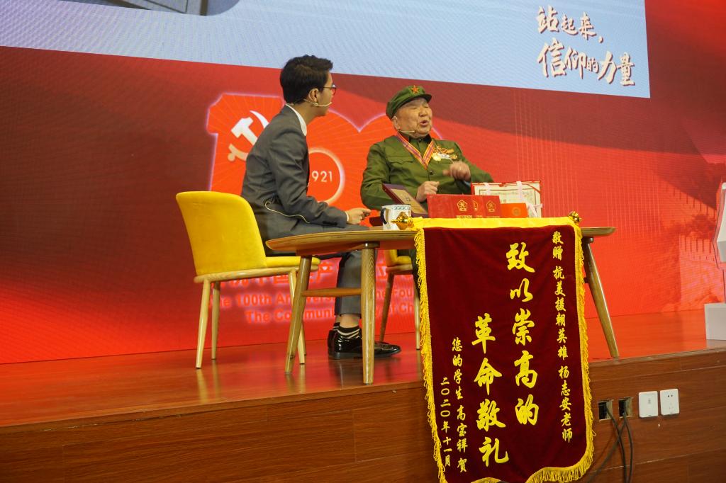 在“学史增信篇”中,环境与土木工程学院本科生土木专业党支部党员、茅以升特称团支部书记毛鹏涛担任主持人,对2138cc太阳集团退休副教授、抗美援朝战士杨志安进行了对话访谈。杨志安首先讲述了他的“信仰之根”,受良好成长环境的影响,他从小就在心里埋下了保家卫国的种子,因此未等成年就入伍参军。杨志安铸就信仰之魂,是不畏敌人的强大、作战环境的恶劣,毅然投身于抗美援朝战场中。他强调,对党的信仰与党的正确领导是战争获得胜利的关键。杨志安复员转业后,服从组织安排,执起教鞭,有教无类,关心学生,追随党的引导,经过几十年如一日的努力后,成功入党,桃李满天下,这是杨志安的信仰之守”。
