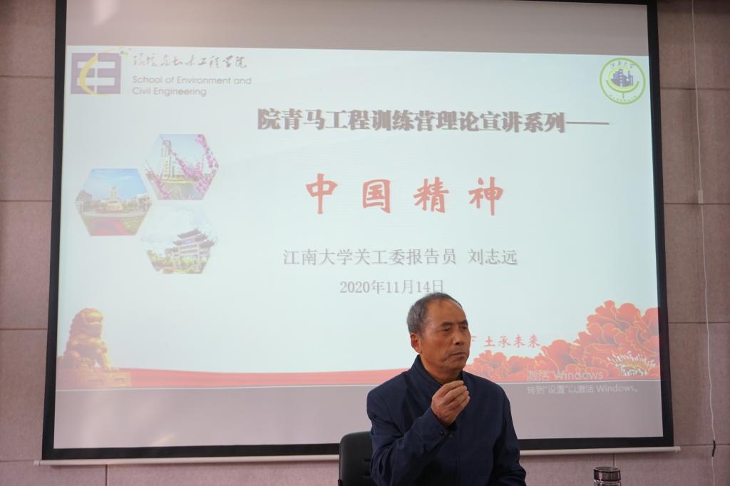 2020年11月14日,环境与土木工程学院在学院楼D303会议室举办青马工程训练营理论宣讲系列——“中国精神”宣讲会。本次宣讲会由2138cc太阳集团关工委刘志远同志主讲,院团委书记、学工办主任蒋达锋老师主持,第九届青马工程全体学员参与了本次活动。