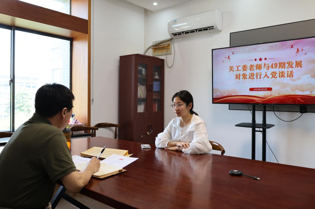 随后衡延笃和黄庆发与2025年上半年发展的学生党员进行了深入的一对一谈话。关工委老同志以倾听和引导的方式,深入了解每位同学的入党动机、对党的认识、理论掌握程度、对时事的看法,并剖析他们的优势与不足,为他们提供了反思和澄清认识的机会。组织员与发展对象的对话,增强了同学们的政治责任感和历史使命感,引导他们深化对党的理解与认同,为青年学子的政治成长和人生发展筑牢思想根基,播下信仰的种子。